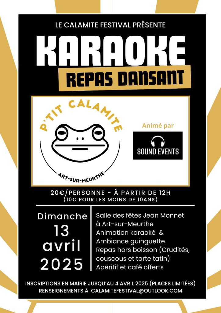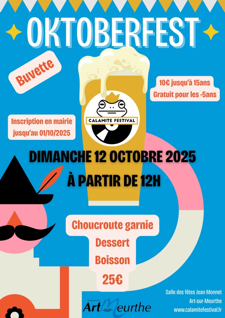 Venez partager un moment convivial à la Salle des Fêtes Jean Monnet d’Art-sur-Meurthe ! Pour son troisième évènement de l’année l’équipe du Calamite Festival vous accueille dans une ambiance folklorique, autour d’une bonne choucroute et d’un verre.